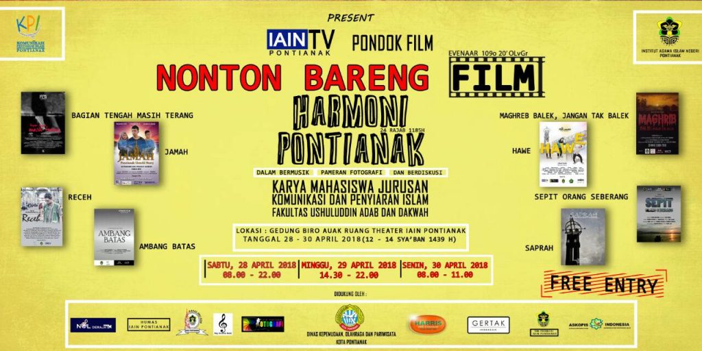 Mahasiswa Jurusan Komunikasi Penyiaran Islam Fakultas Ushuluddi, Adab, dan Dakwah IAIN Pontianak kembali berkarya dengan sejumlah film yang telah ditayangkan pada 28 s.d. 30 April 2018, di Gedung Teater Biro AUAK IAIN Pontianak. Pagelaran yang kesekian kalinya ini mengangkat tema: Harmoni Pontianak. Konsep kegiatan nonton bareng yang didukung oleh IAIN TV dan Pondok Film menayangkan 8 film. Bagi siapa saja yang ingin menonton tidak dipungut biaya sepersenpun alias gratis.