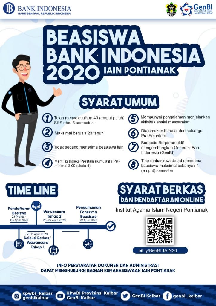 PONTIANAK (iainptk.ac.id) IAIN Pontianak yang bekerja sama dengan Bank Indonesia membuka kembali peluang Beasiswa Bank Indonesia Tahun 2020.