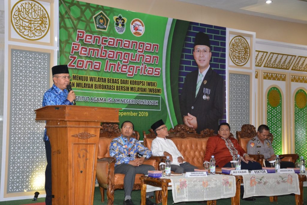 PONTIANAK (iainptk.ac.id)– IAIN Pontianak sukses menggelar kegiatan Pencanangan Pembanganan Zona Integritas Menuju Wilayah Bebas dari Korupsi (WBK) dan Wilayah Birokrasi Bersih Melayani (WBBM). Acara itu berlangsung di Aula Syeikh Abdul Rani Mahmud, Jum’at (29/11/2019). Tampak hadir Ombusmen Republik Indonesia Perwakilan Kalimatan Barat, Polresta Pontianak, Ketua MUI Kalimatan Barat dan Ketua DPD RI dapil Kalbar, H.