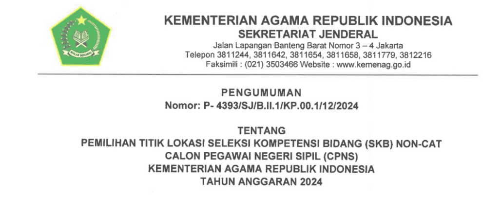 Pontianak (iainptk.ac.id) – Kementerian Agama Republik Indonesia telah mengeluarkan pengumuman terkait pemilihan titik lokasi Seleksi Kompetensi Bidang (SKB) Non-CAT untuk Calon Pegawai Negeri Sipil (CPNS) Tahun Anggaran 2024. Pengumuman ini disampaikan melalui surat resmi bernomor P-4393/SJ/B.II.1/KP.00.1/12/2024. Dalam pengumuman tersebut, peserta yang dinyatakan lulus Seleksi Kompetensi Dasar (SKD) diwajibkan untuk memilih lokasi pelaksanaan SKB Non-CAT. Proses […]