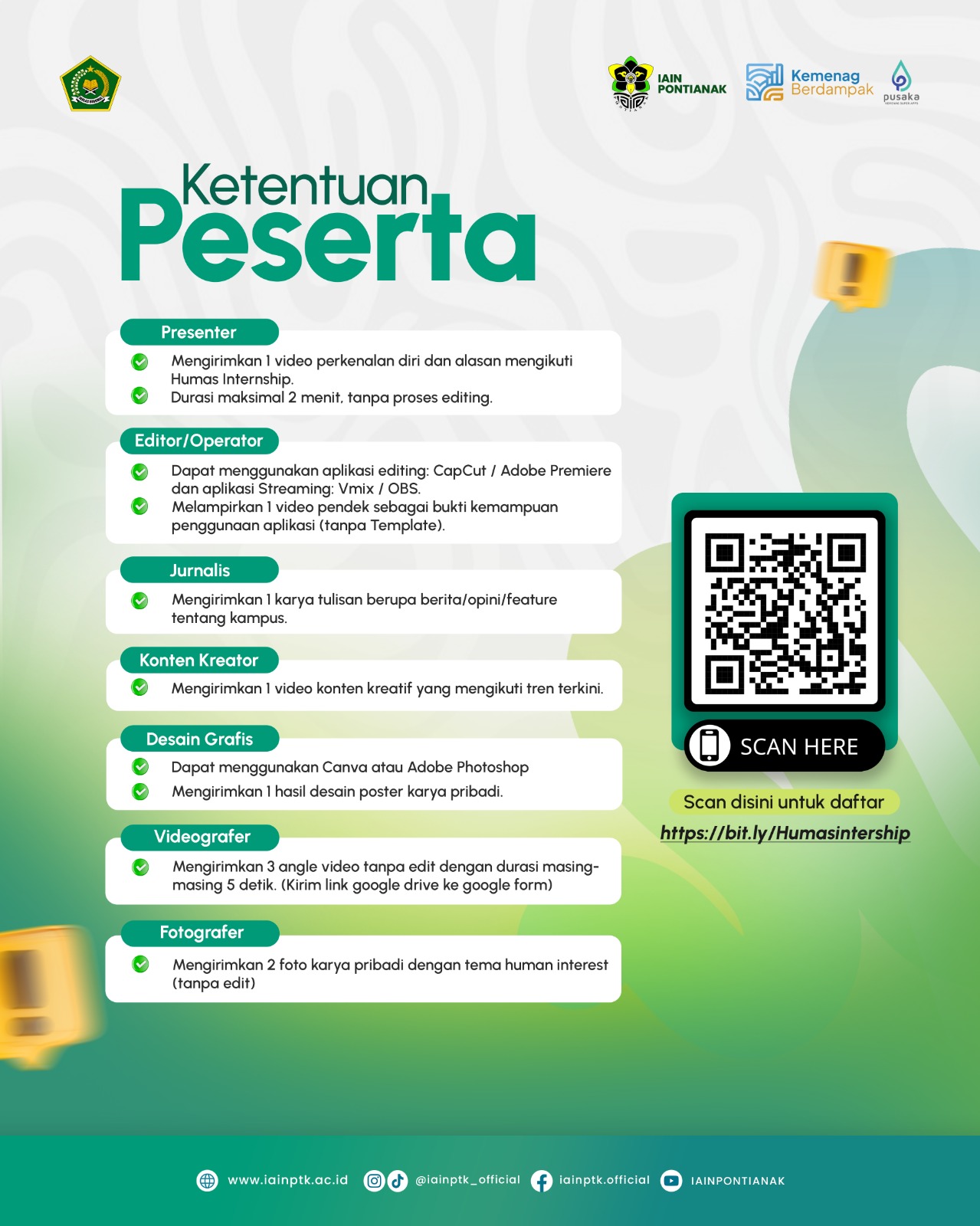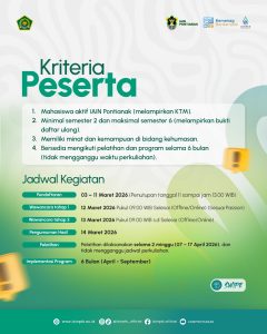 Program Humas Internship ini terbuka bagi mahasiswa aktif IAIN Pontianak yang memiliki minat dan kemampuan di bidang komunikasi serta kreatif digital. Peserta yang terpilih nantinya akan mengikuti rangkaian pelatihan dan praktik selama enam bulan, mulai April hingga September 2026.