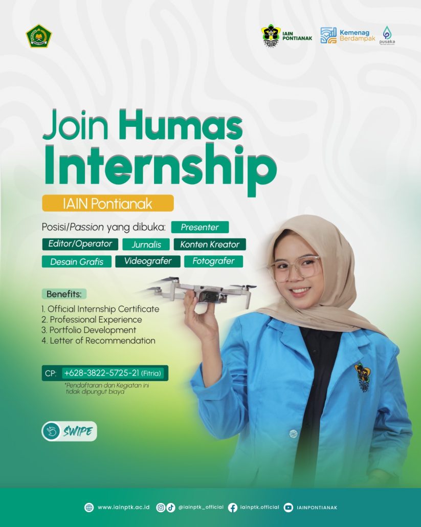 Pontianak (iainptk.ac.id) 4 Maret 2026 — Institut Agama Islam Negeri (IAIN) Pontianak membuka kesempatan bagi mahasiswa aktif untuk mengikuti program Humas Internship yang diselenggarakan oleh bagian Humas IAIN Pontianak. Program ini bertujuan memberikan pengalaman langsung kepada mahasiswa dalam bidang kehumasan, produksi konten, serta pengelolaan media publikasi kampus.