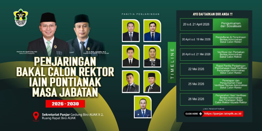 Pontianak (iainptk.ac.id) Senin, 20 April 2026 – Institut Agama Islam Negeri (IAIN) Pontianak resmi mengumumkan pembukaan proses penjaringan Bakal Calon Rektor untuk Masa Jabatan 2026–2030. Pengumuman ini dikeluarkan oleh Panitia Penjaringan melalui surat resmi nomor 02/In.15/PANJAR-BCR/04/2026 tanggal 20 April 2026.