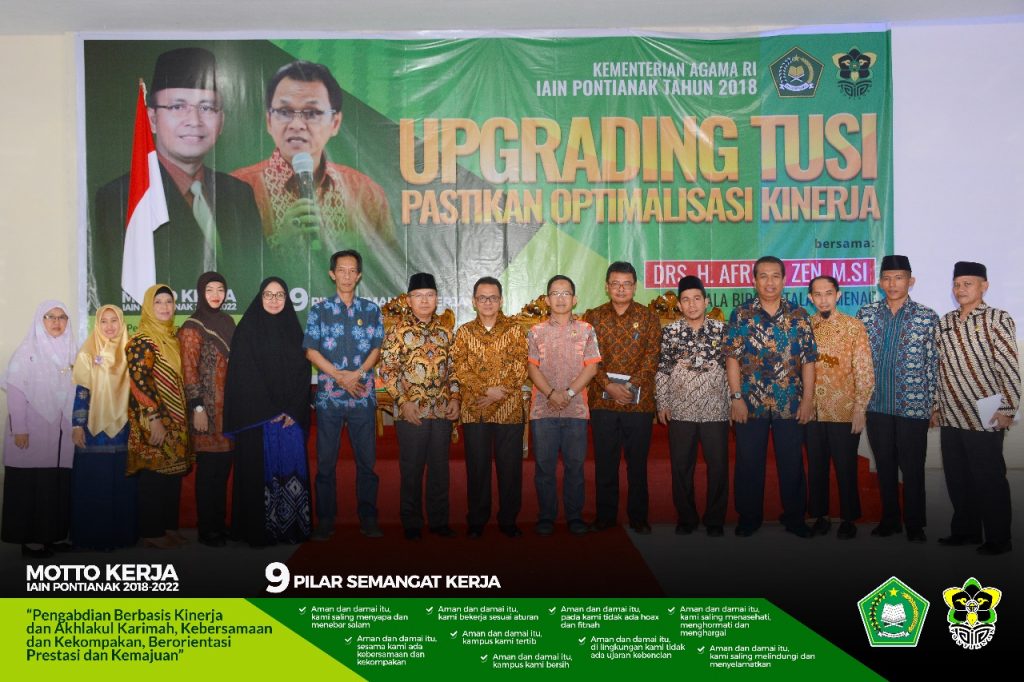 PONTIANAK (iainptk.ac.id)–IAIN Pontianak menyelenggarakan kegiatan Upgrading Tugas dan Fungsi (Tusi) dengan mengusung tema “Pastikan Optimalisasi Kinerja”, Kamis (29/11) di Auditorium Syeikh Abdul Rani Mahmud. Acara tersebut dibuka dengan sambutan Rektor IAIN Pontianak, Dr. H. Syarif, MA. Kepala Biro Organisasi dan Tata Laksana Sekretariat Jenderal Kementerian Agama RI, Drs. H. Afrizal Zen, M.Si, hadir sebagai narasumber mewakili Sekretaris Jenderal Kemenag RI.