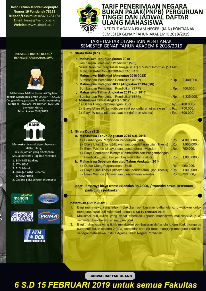 PONTIANAK (iainptk.ac.id)–“Proses daftar ulang untuk semester genap tahun 2018-2019 pada prinsipnya sama dengan tahun-tahun sebelumnya. Namun yang membedakan tahun ini yaitu pembayaran melalui aplikasi host to host edupay. Dengan adanya aplikasi ini, mahasiswa dimudahkan dalam pembayarannya. Tidak harus datang ke kampus untuk membayar SPP, tetapi dapat membayarnya melalui BSM Net Banking, ATM BSM, ATM Mandiri, Jaringan ATM Bersama dan ATM Prima, maupun cabang-cabang BSM di seluruh Kalimantan Barat. Daftar ulang dimulai tanggal 6 sampai 15 Februari 2019”