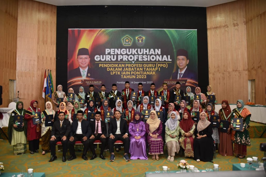 Pontianak (iainptk.ac.id) Sebanyak 248 mahasiswa Pendidikan Profesi Guru (PPG) Pendidikan Agama Islam (PAI) dan Madrasah Dalam Jabatan (Daljab) Batch 1 Tahun 2023 Lembaga Pendidikan dan Tenaga Kependidikan (LPTK) Institut Agama Islam Negeri (IAIN) Pontianak mengikuti Pengukuhan Guru Profesional pada Kamis, (14/12/2023) bertempat di Hotel Harris Pontianak. Hadir dalam acara pengukuhan tersebut Kepala Kantor Kementian Agama Kalimantan Barat Dr. Muhammad Muhajirin Yanis, M.Pd.I., Wakil Rektor I Bidang Akademik dan Pengembangan Lembaga Dr. Ali Hasmy, M.SI., Wakil Dekan I Eka Hendry AR, S.Ag., S.Pd., M.Si., M.Pd, Ketua Prodi PPG, Ana Rosilawati, M.Ag., jajaran Dosen, Guru Pamong, tamu undangan, dan jajaran pengelola Prodi PPG.