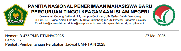 Panitia Nasional Penerimaan Mahasiswa Baru Perguruan Tinggi Keagamaan Islam Negeri (PTKIN) resmi mengumumkan perubahan jadwal pelaksanaan Ujian Masuk Perguruan Tinggi Keagamaan Islam Negeri (UM-PTKIN) tahun 2025.
