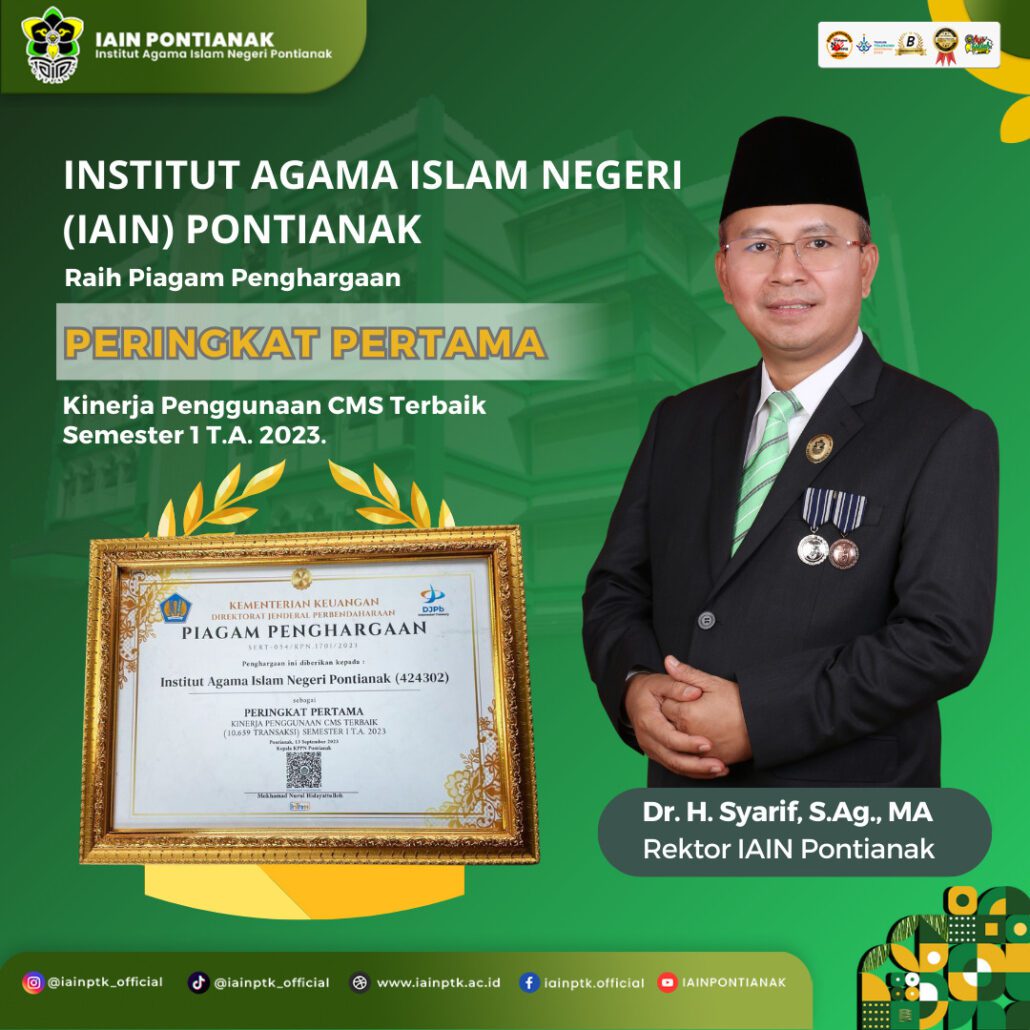Dalam kesempatan ini, Rektor IAIN Pontianak, Dr. H. Syarif, S.Ag., MA., menyatakan, “Alhamdulillah IAIN Pontianak kembali meraih Peringkat Terbaik Pertama Kinerja Penggunaan CMS Semester 1 T.A. 2023. Pemberian penghargaan ini tentu merupakan bukti bahwa ketika terus bekerja dengan semangat kinerja, maka hasilnya akan baik. Oleh karena itu, kita harus On the Track dalam bekerja dengan semangat awal motto kerja kita yakni ‘Pengabdian Berbasis Kinerja dan Akhlakul Karimah, Kebersamaan dan Kekompakan Berorientasi Prestasi dan Kemajuan,’” ungkapnya.