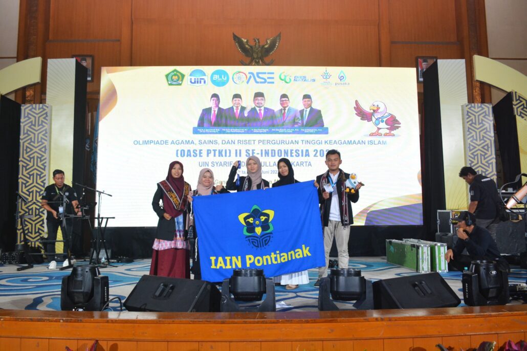 Jakarta (iainptk.ac.id) – Jumat, 16 Juni 2023, Kebahagiaan terpancar diarea duduk delegasi IAIN Pontianak ketika mendengarkan panitia membacakan para juara dimalam closing ceremony Olimpiade Agama, Sains, dan Riset Perguruan Tinggi Keagamaan Islam (OASE PTKI) II 2023, yang dilaksanakan di Auditorium Harun Nasution Universitas Islam Negeri (UIN) Syarif Hidayatullah Jakarta. Dari empat cabang yang diikuti, delegasi IAIN Pontianak berhasil meraih Juara II Stand Ekspo terbaik dan Juara 6 Karya Tulis Al-Qur’an.