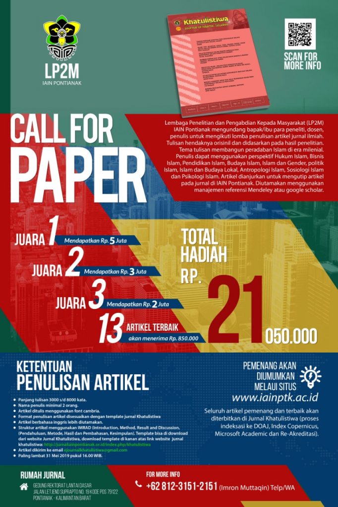Dalam hal ini penulis dapat menggunakan perspektif Hukum Islam, Bisnis Islam, Pendidikan Islam, Budaya Islam, Islam dan Gender, Politik Islam, Islam dan Budaya Lokal, Antropologi Islam, Sosiologi Islam dan Psikologi Islam. Artikel ini sendiri dianjurkan untuk mengutip artikel pada jurnal di IAIN Pontianak. Diutamakan menggunakan manajemen referensi Mendeley atau google scholar. Artikel dikirim paling lambat 31 Mei 2019 melalui email: ejournalkhatulistiwa@gmail.com.